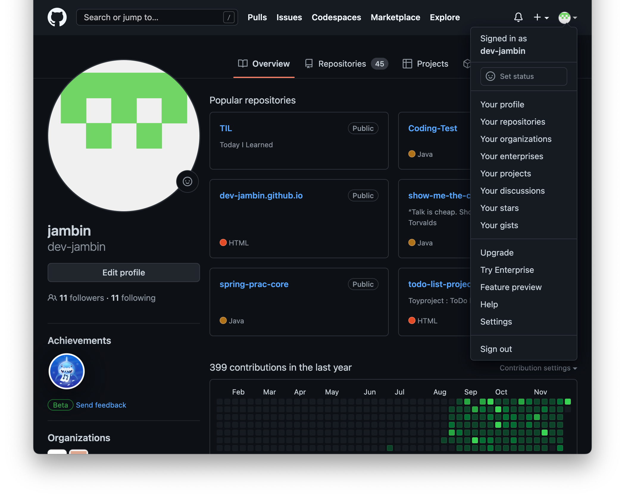 - Github 로그인 → 우측 상단의 프로필 이미지 클릭 → Settings 클릭