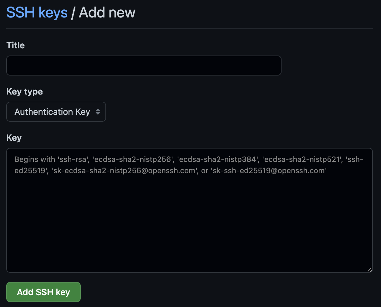 - Title 작성, Key에 복사해둔 공개키를 붙여넣는다. → Add SSH Key 버튼을 클릭