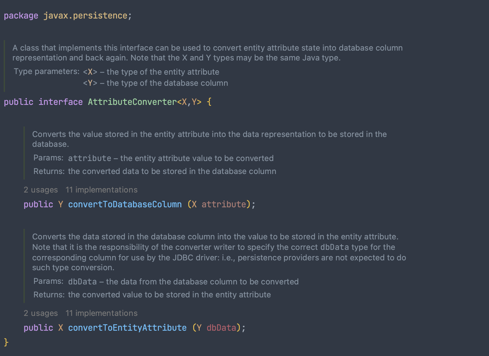 - public X convertToEntityAttribute(Y dbData): 데이터베이스 컬럼에서 엔티티 필드로 데이터를 변환한다.