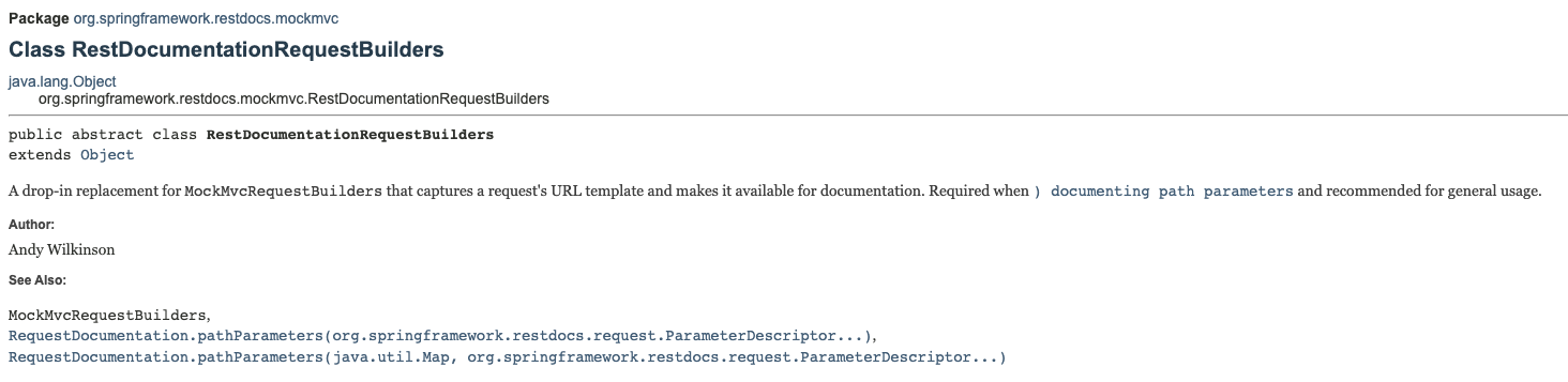 공식 문서를 찾아보면 RestDocumentationRequestBuilders는 MockMvcRequestBuilders를 확장한 클래스이며 pathParameters를 문서화할 때 필요하다고 한다.
