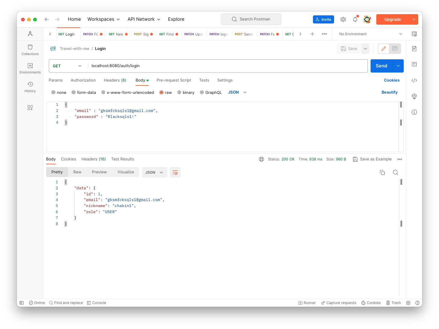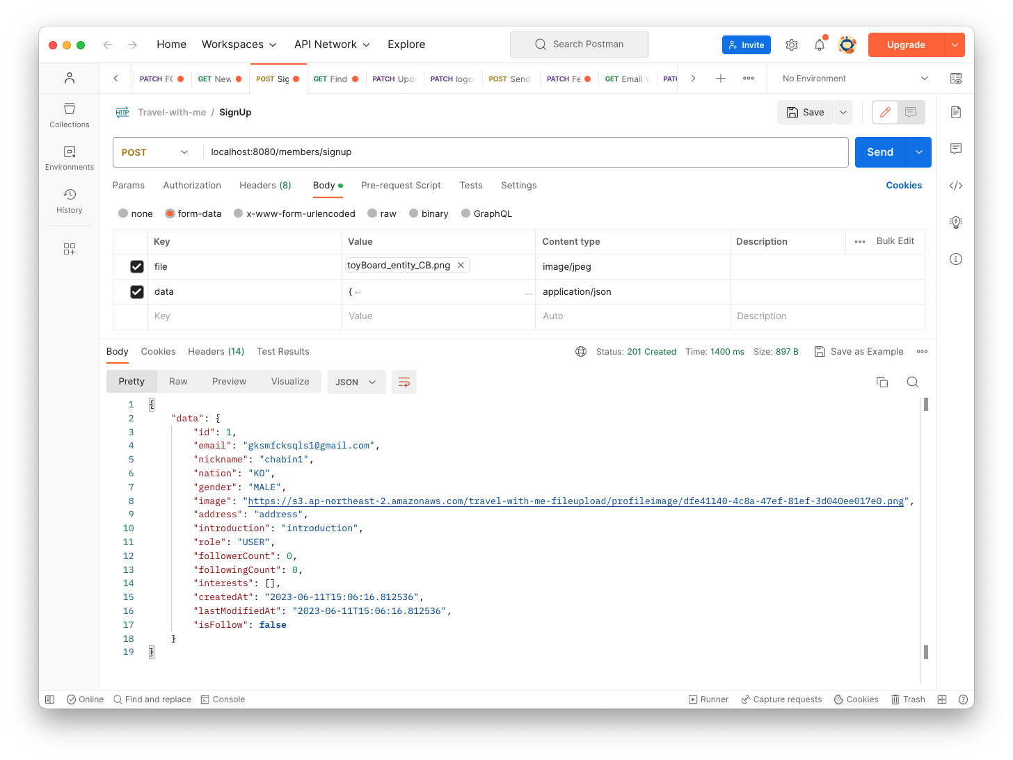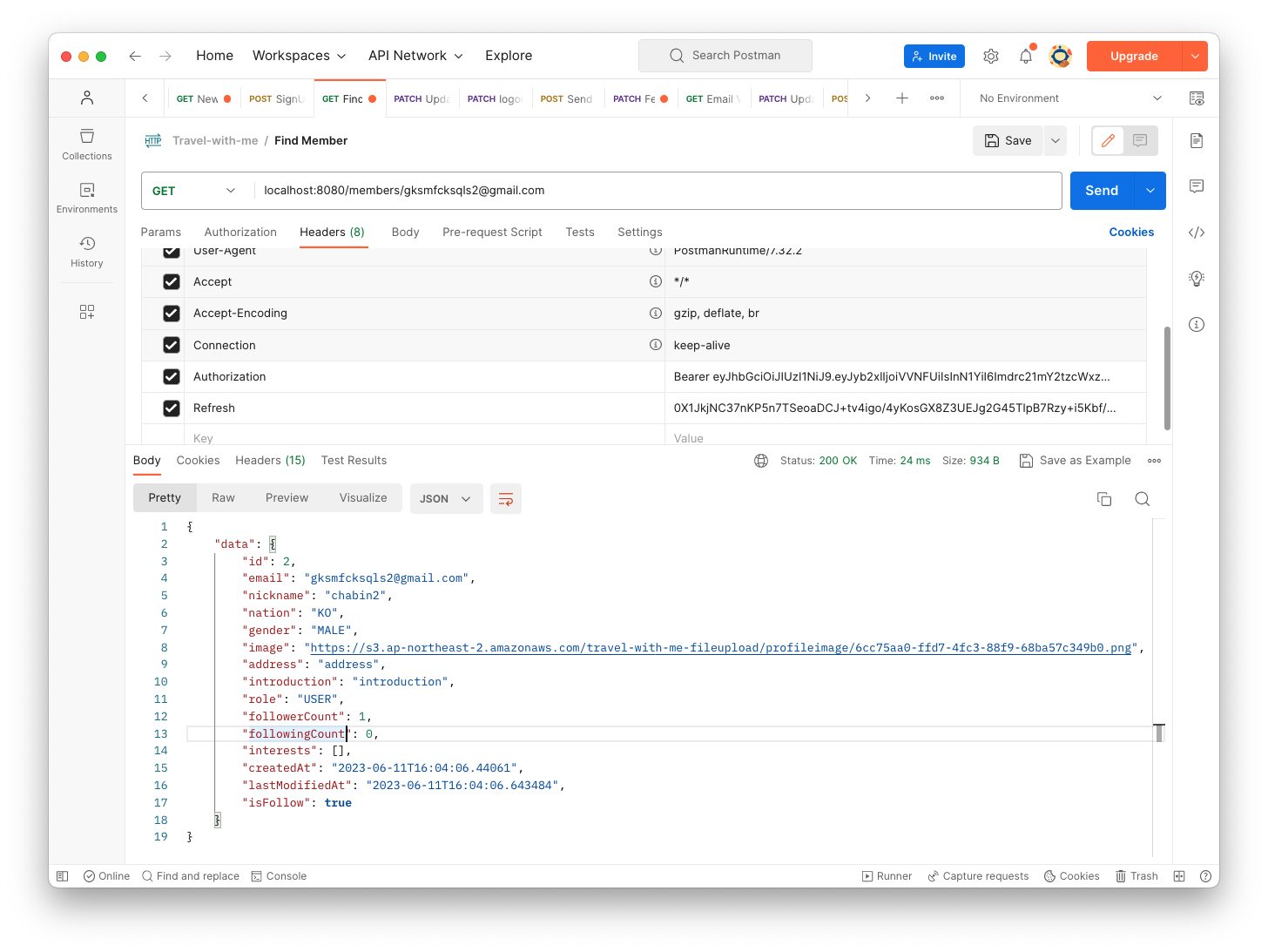 반대로 gksmfcksqls1@gmail.com 회원을 조회해보면 followingCount가 1인 것을 확인할 수 있다.
