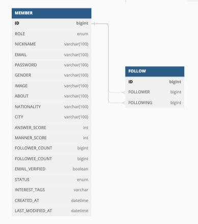 - 이를 통해서 특정 Member의 팔로워들을 조회하거나, 특정 Member가 팔로잉하는 다른 Member들을 조회할 수 있다.