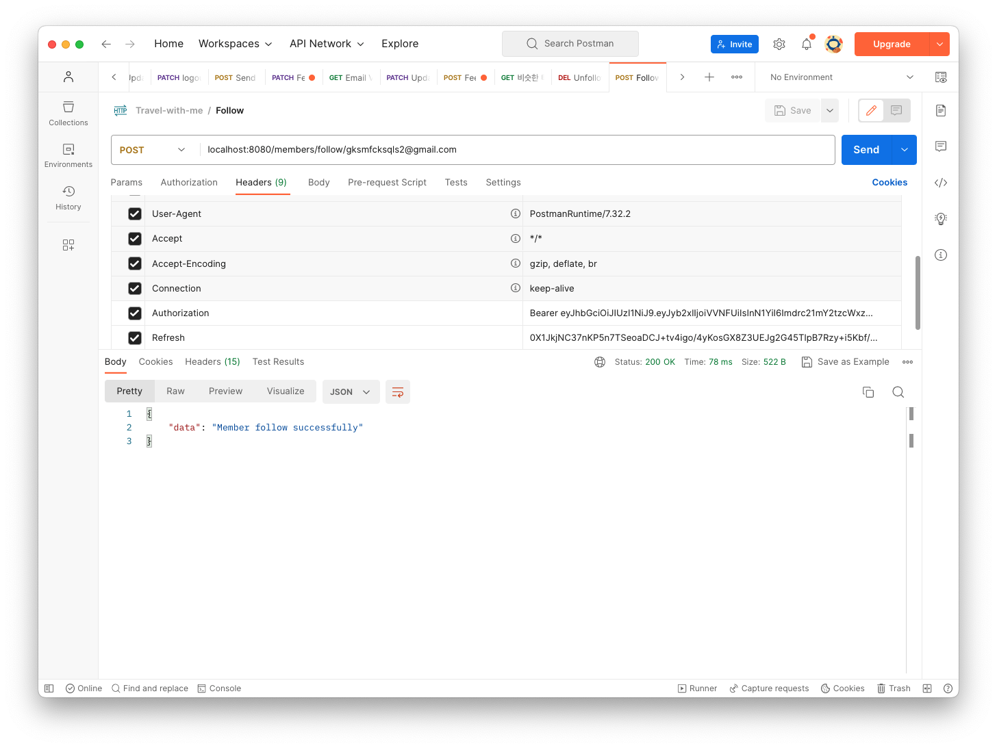 /members/follow/{followee-email}와 /members/unfollow/{followee-email} 엔드포인트를 통해 사용자가 팔로우 및 언팔로우 작업을 수행할 수 있다. 팔로우는 POST, 언팔로우는 DELETE 메서드를 사용했다.