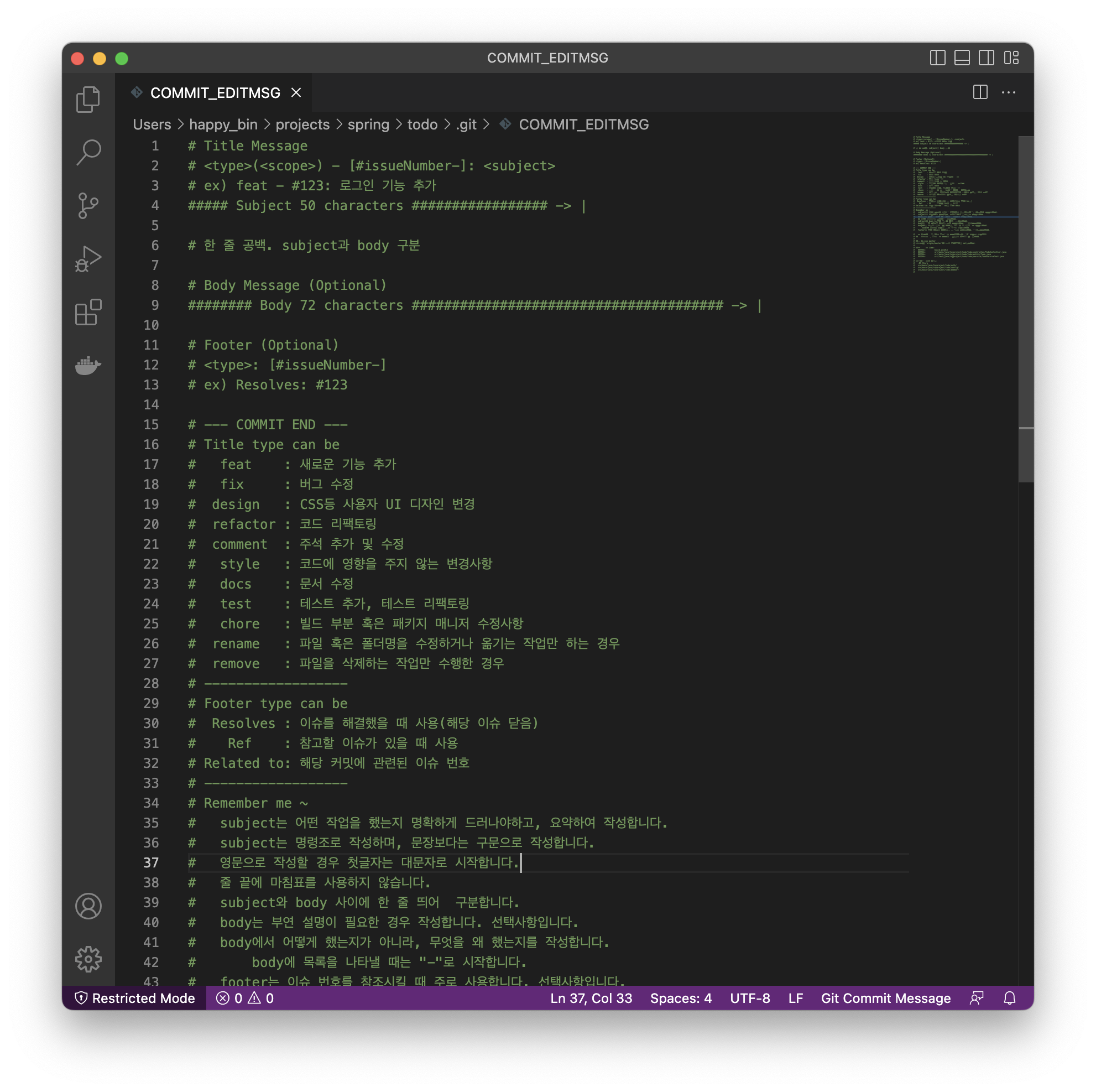 template = /Users/happy_bin/.gitmessage.txt # 작성한 .gitmessage파일이 템플릿 설정되어 있습니다.