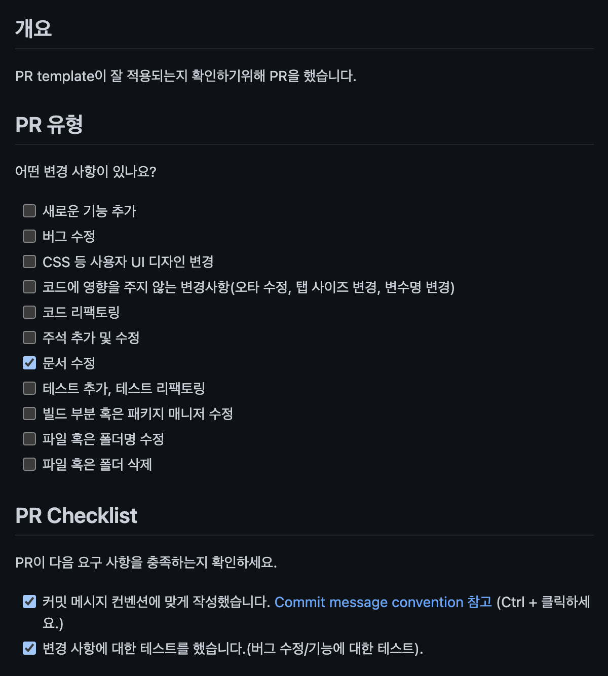 - PR Template을 만들어 Repository에 추가하면 PR을 할 때 PR body에 template의 내용을 자동으로 볼 수 있습니다.