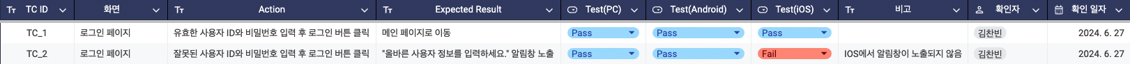 - MOBILE(안드로이드, IOS), PC 기종 별로 테스트가 진행되어야 하기 때문에 각 기종 별로 성공여부 컬럼을 만들었다.