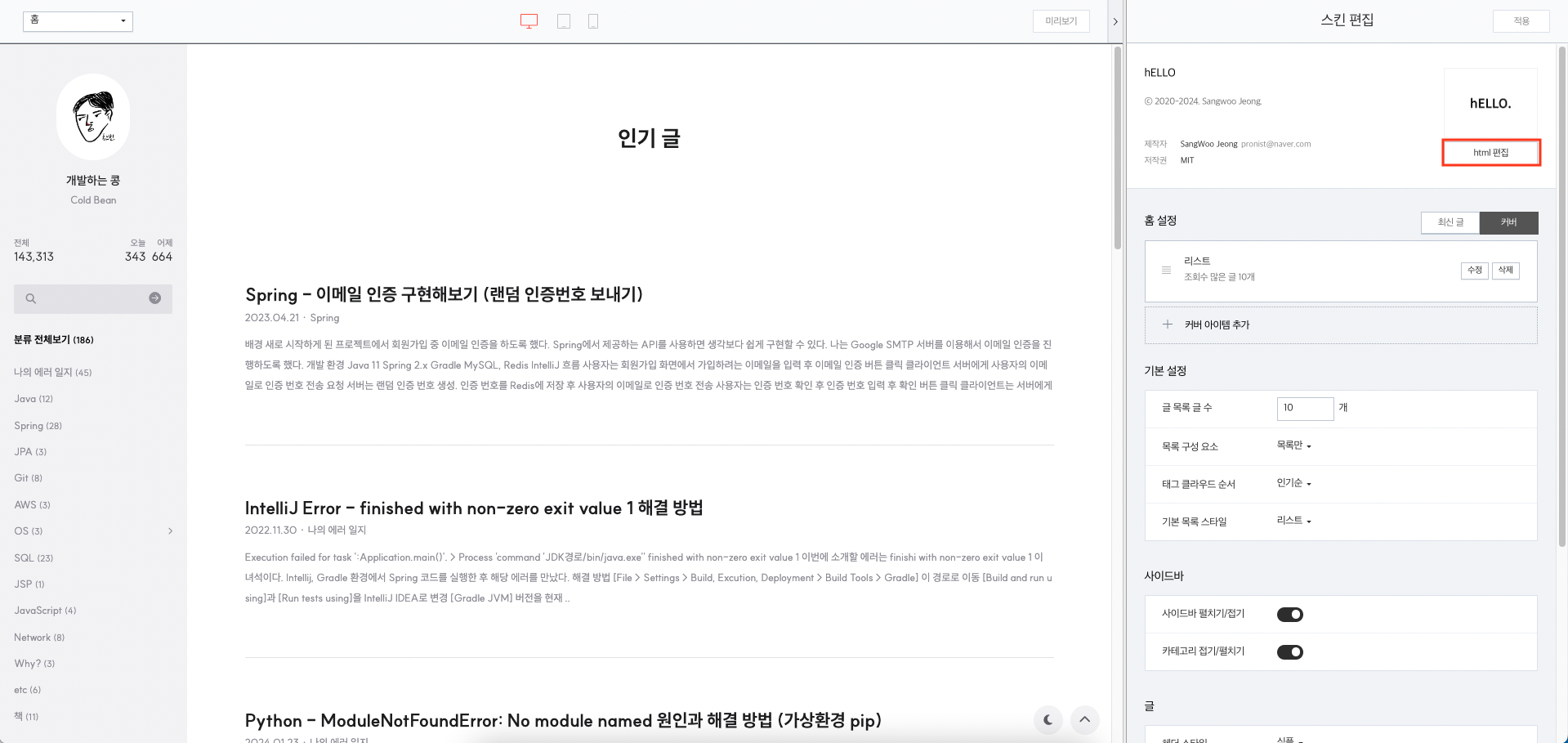 티스토리에는 스킨 편집으로 스킨의 html, css 코드를 입맛에 맞게 수정할 수 있다.