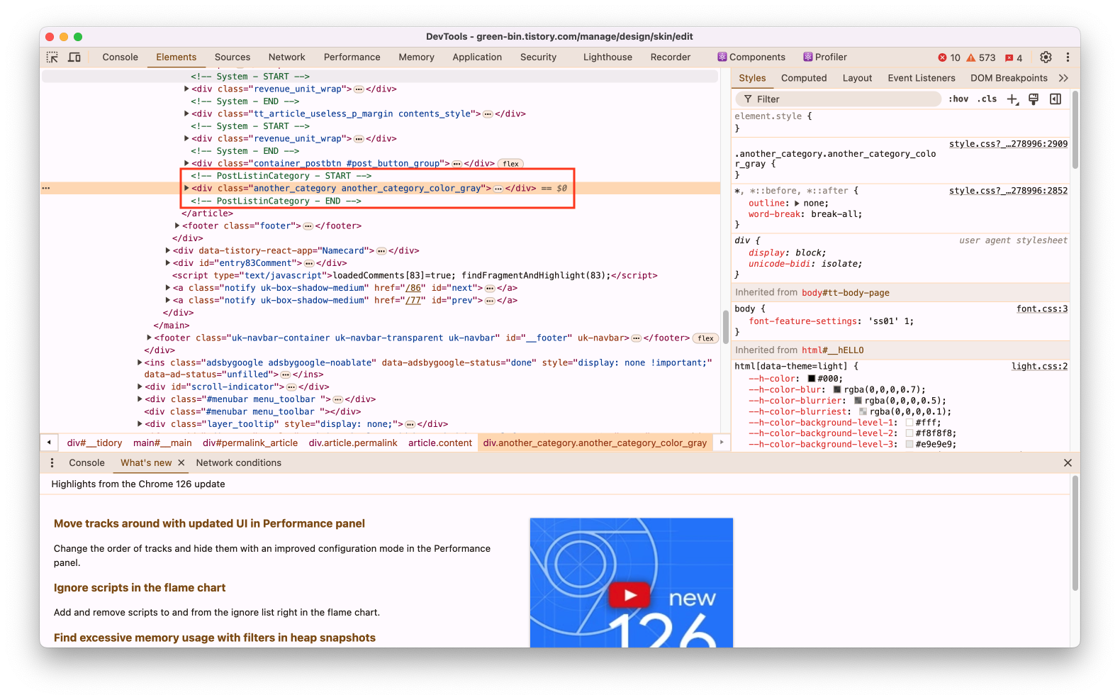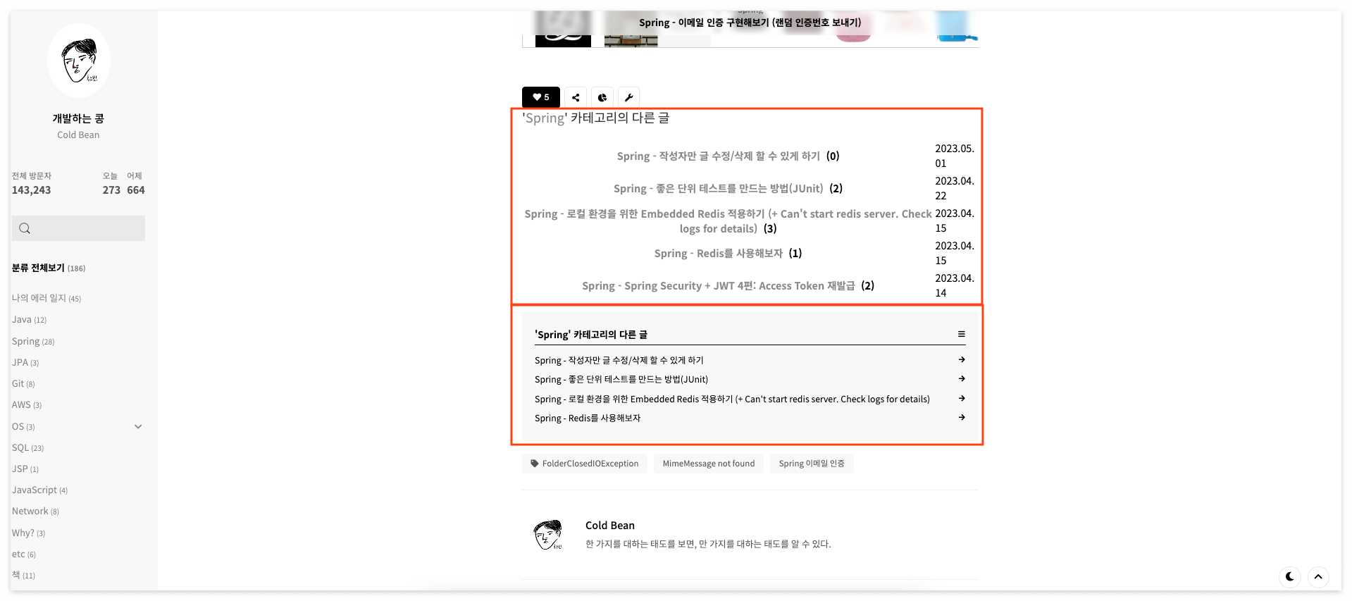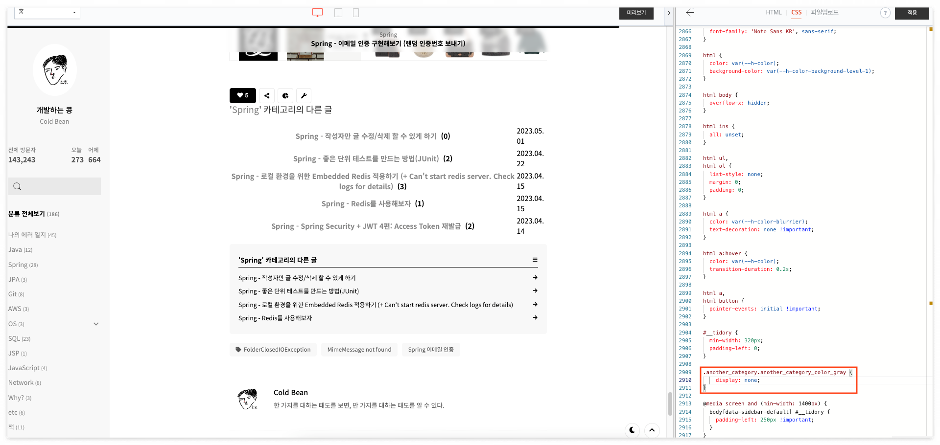 어느 때처럼 잘 사용하다가 '카테고리의 다른 글' 항목이 2중으로 노출되고 있는걸 발견했다. 하나는 CSS도 적용되지 않은채로 노출되고 있었다.