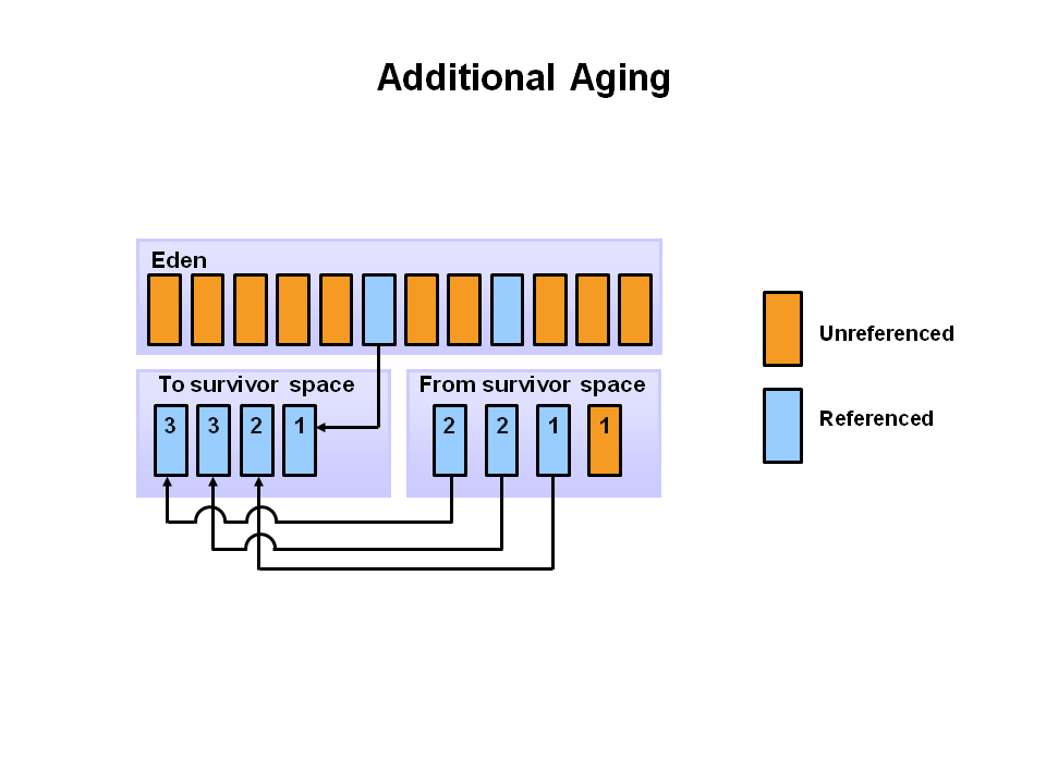 - Young Generation: 객체가 생성되면 할당되는 영역이다. Young Generation이 가득 차면 MinorGC가 발생한다. Minor GC는 매우 빠르게 참조되지 않은 객체를 수집한다. 살아남은 객체(참조되는 객체) age가 올라가고 일정 수준 age가 되면 Old Generation으로 이동한다.
