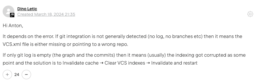 JetBrains Support 쪽 질문에 비슷한 현상에 대한 글이 있었고 거기에 담당자가 남긴 답변에서 이러한 현상이 발생할 수 있는 두 가지 원인에 대해 언급하고 있다.