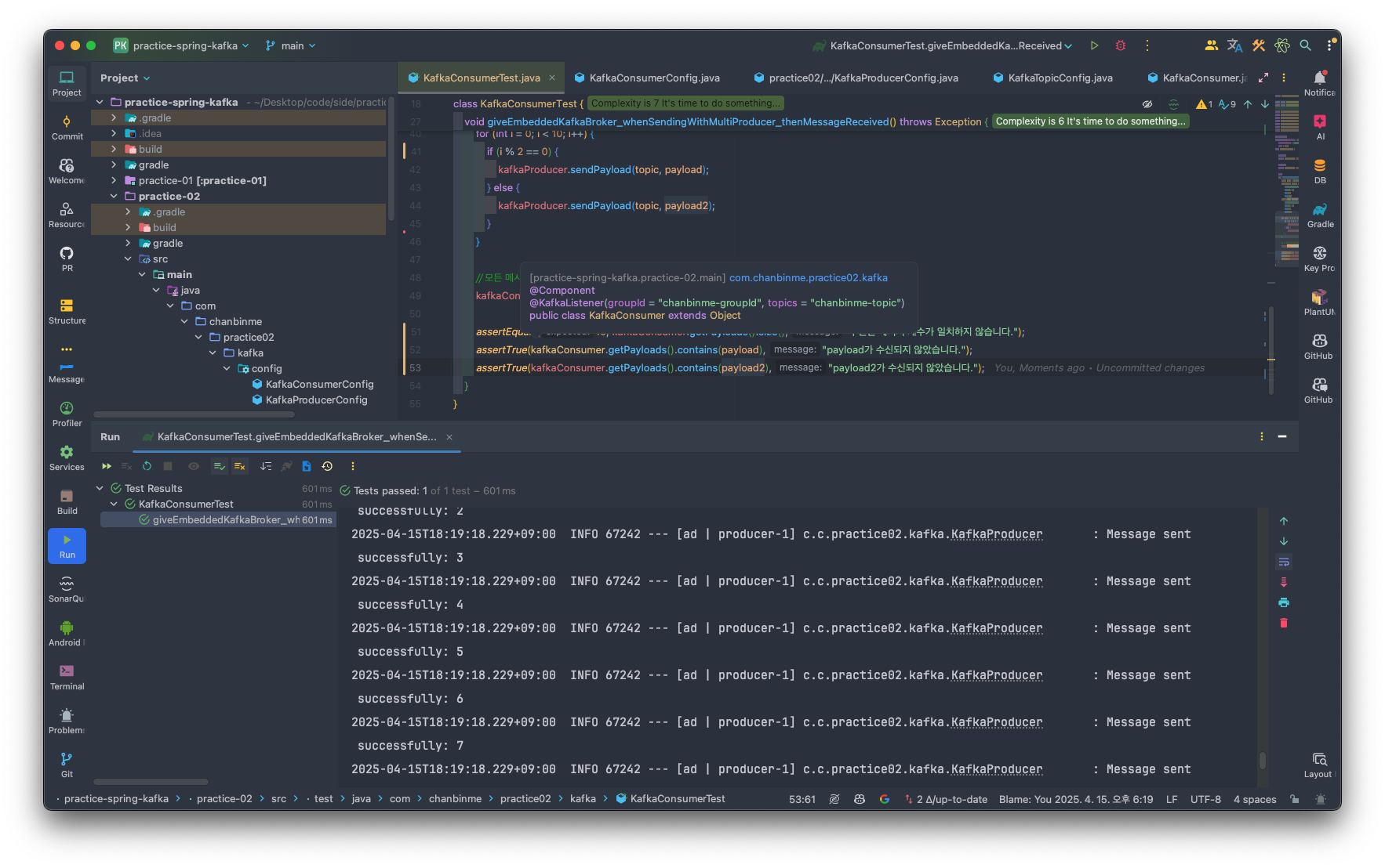 - @KafkaListener: 이 클래스가 chanbinme-groupId 그룹으로 chanbinme-topic 토픽의 메시지를 구독함을 선언한다.