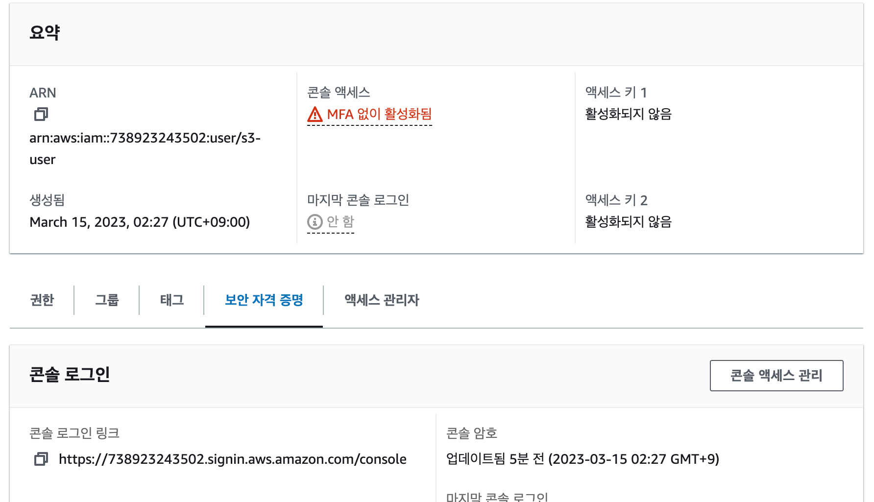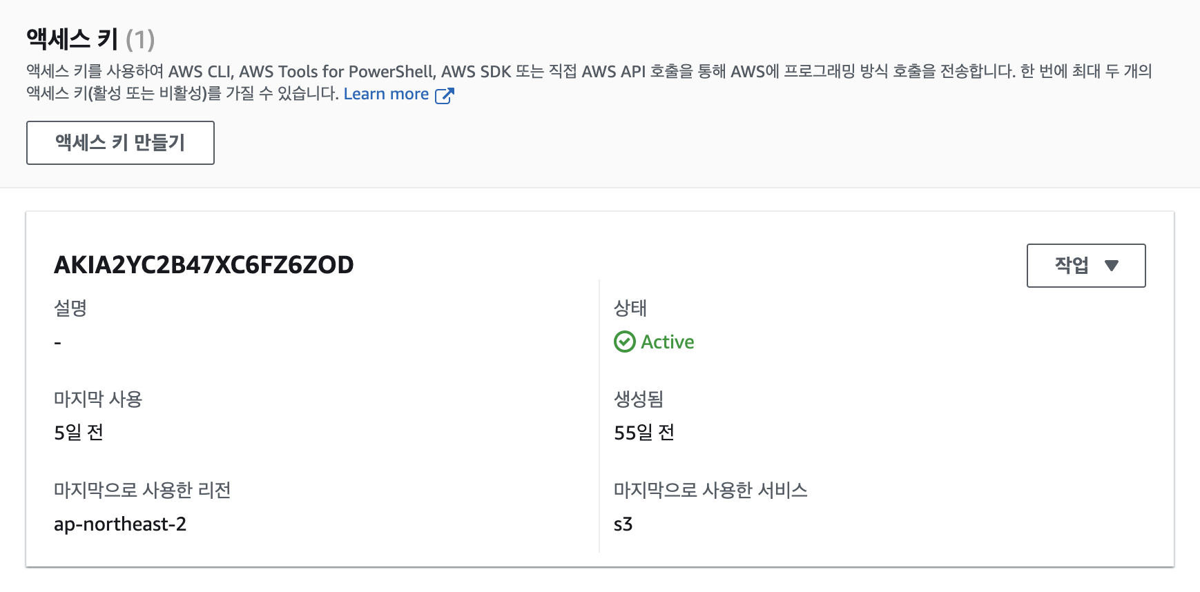 액세스 키를 발급받아야 한다. 발급된 Access Key와 Secret Key를 활용해서 우리 서비스 애플리케이션에서 버킷에 접근할 수 있다.