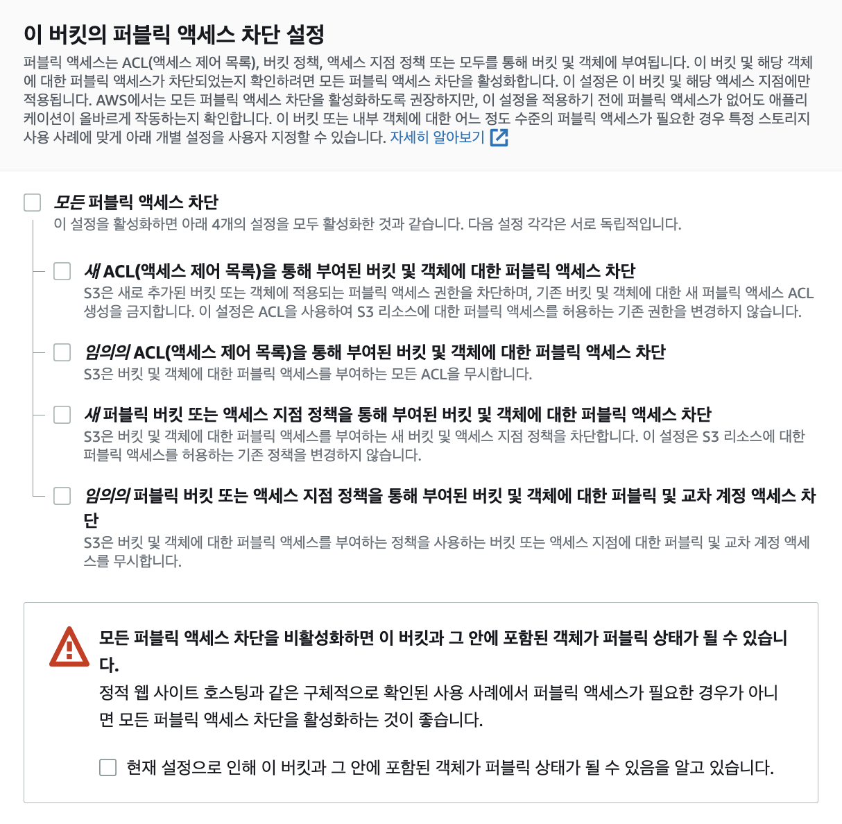 퍼블릭 액세스 차단을 위한 버킷 설정에 기본적으로 체크가 되어있다. 이 경우 외부에서 버킷에 접근할 수 없다.