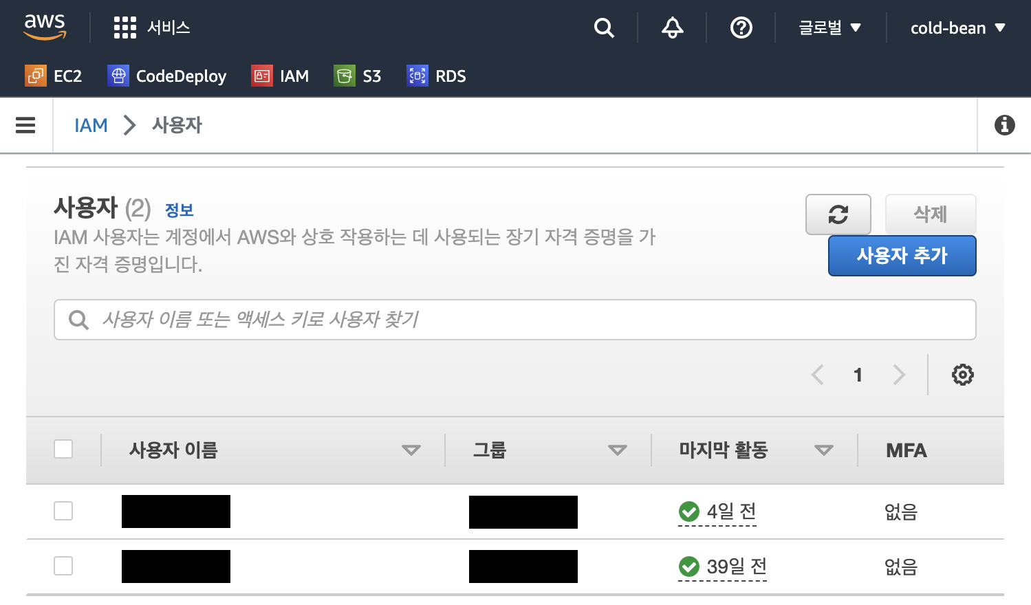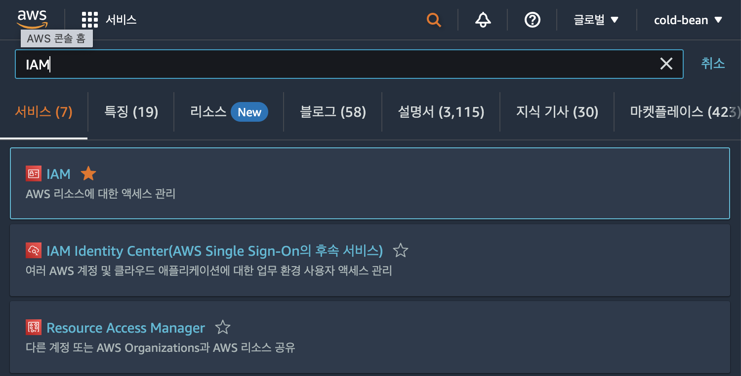 AWS 서비스 중 IAM에 접근한다. 즐겨찾기를 해놓으면 편하다.