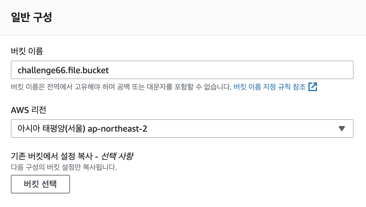 버킷 이름은 지역과 상관없이 AWS 리전에 상관없이 고유한 이름이어야 한다. AWS 리전은 서울로 설정한다.