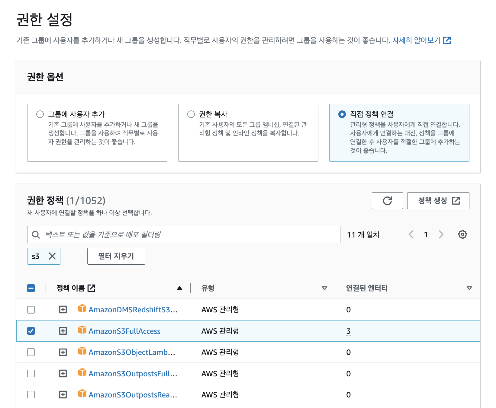 S3에 접근하기 위한 AmazonS3FullAccess를 정책으로 설정해 준다.
