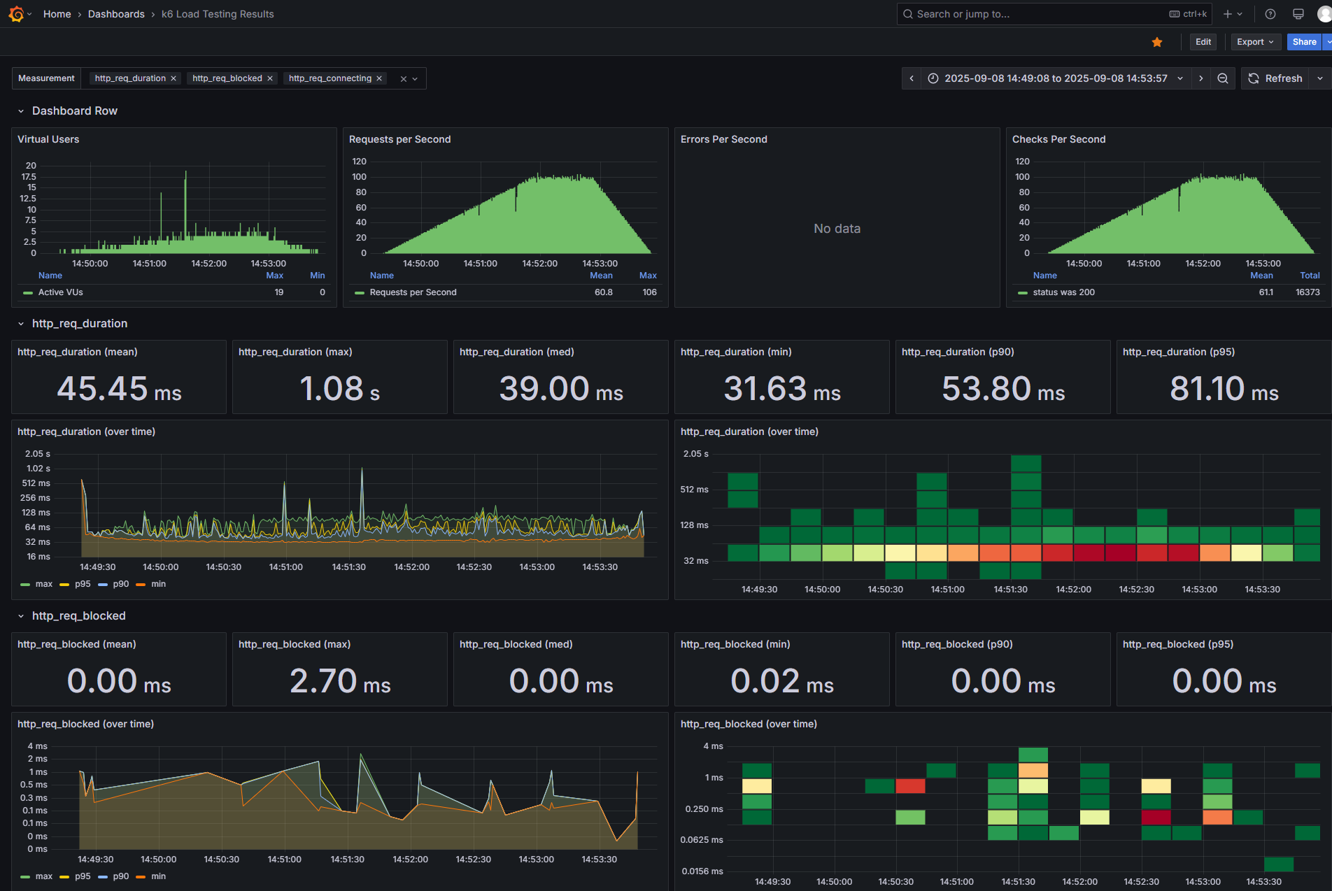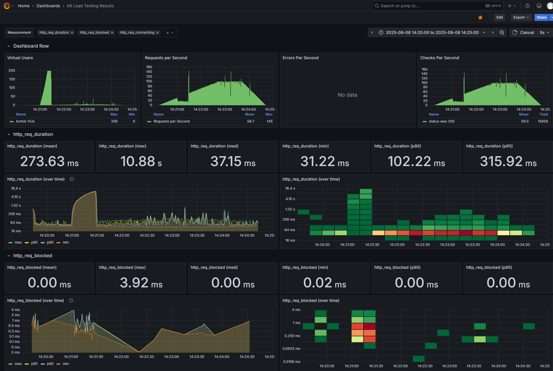 - http_req_connecting: TCP 연결 설정 시간