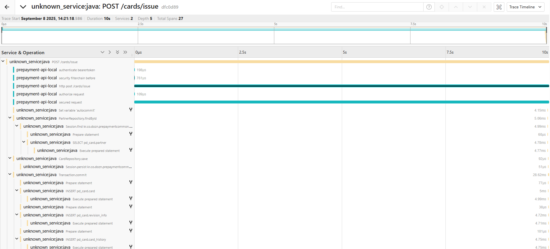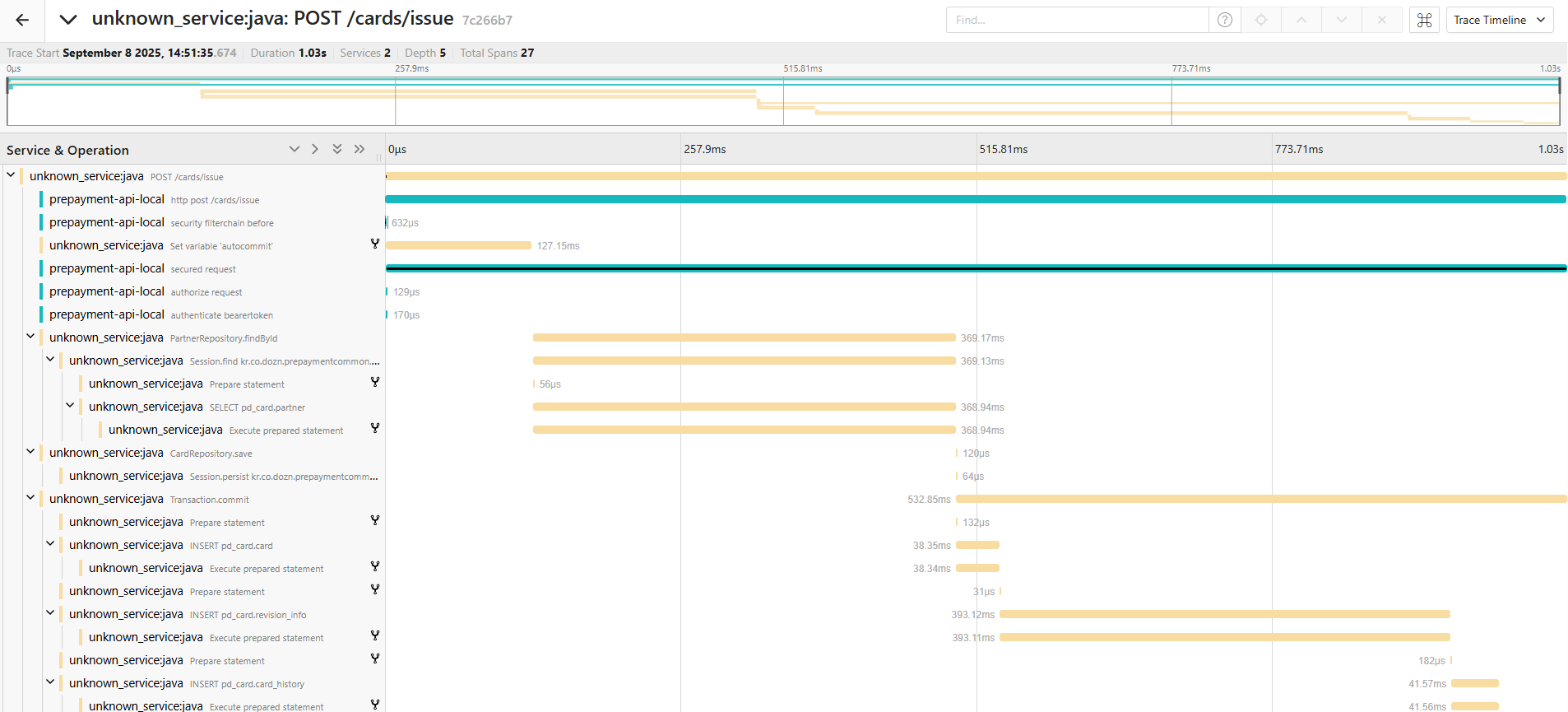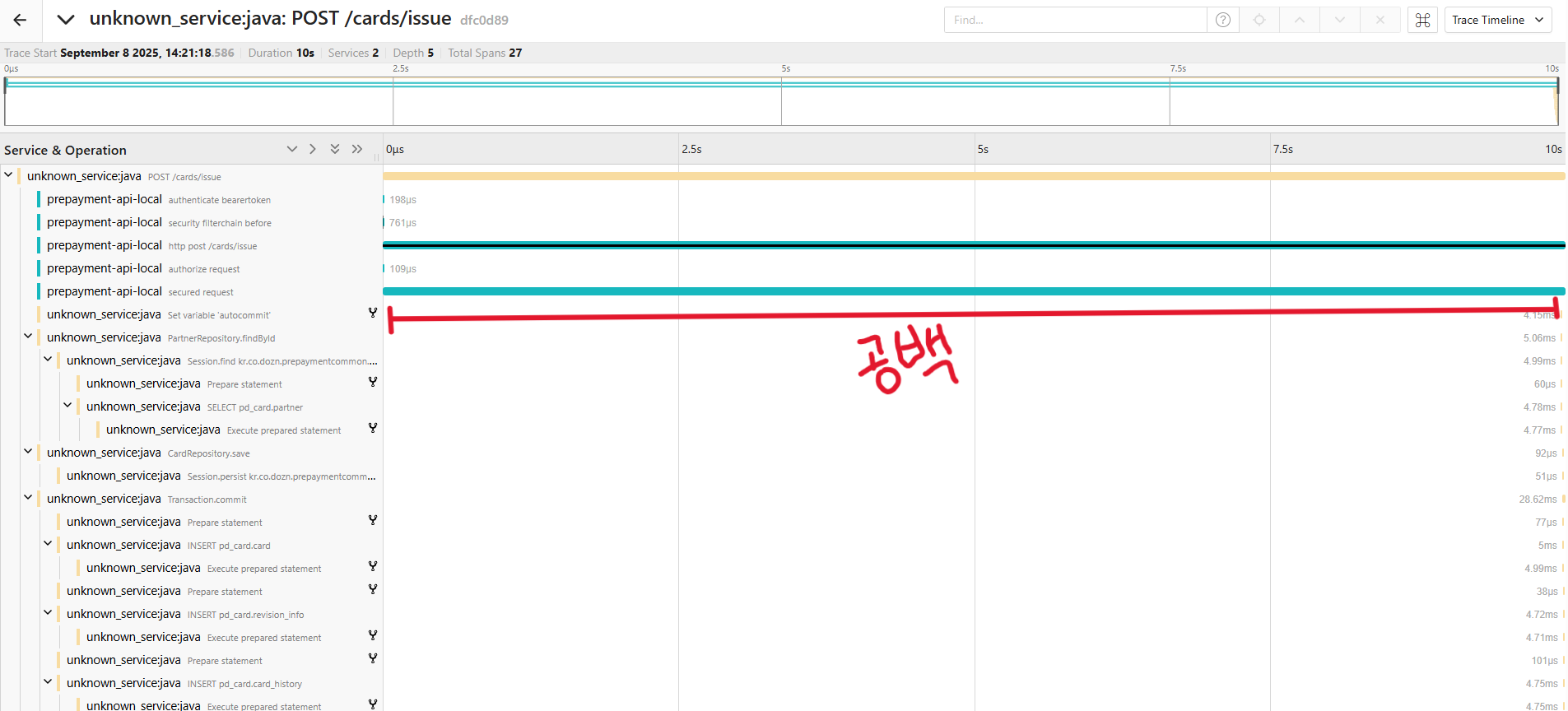 - 여러 요청에서 스팬과 스팬 사이의 공백 구간이 길게 관찰되는 것을 볼 수 있다.