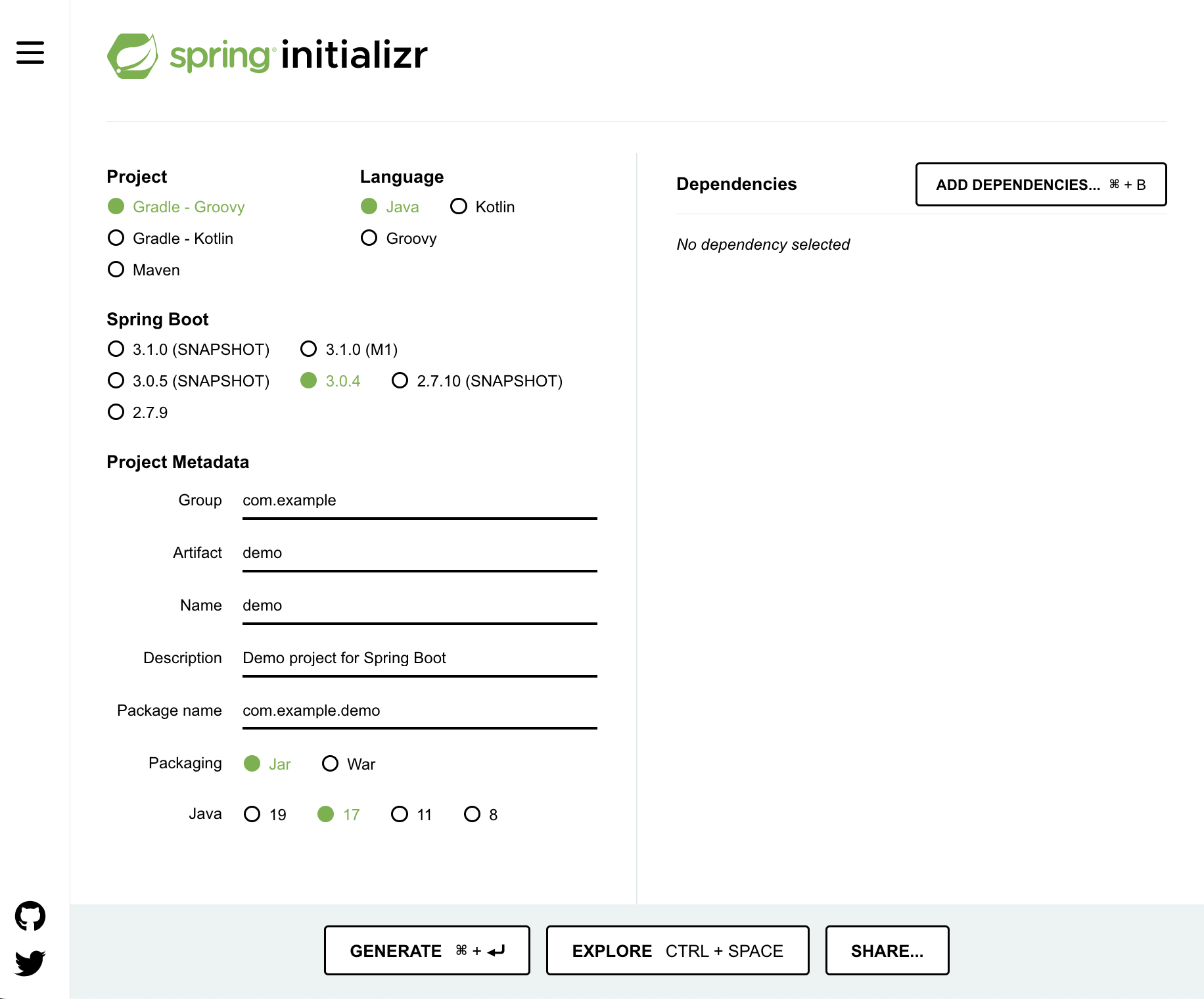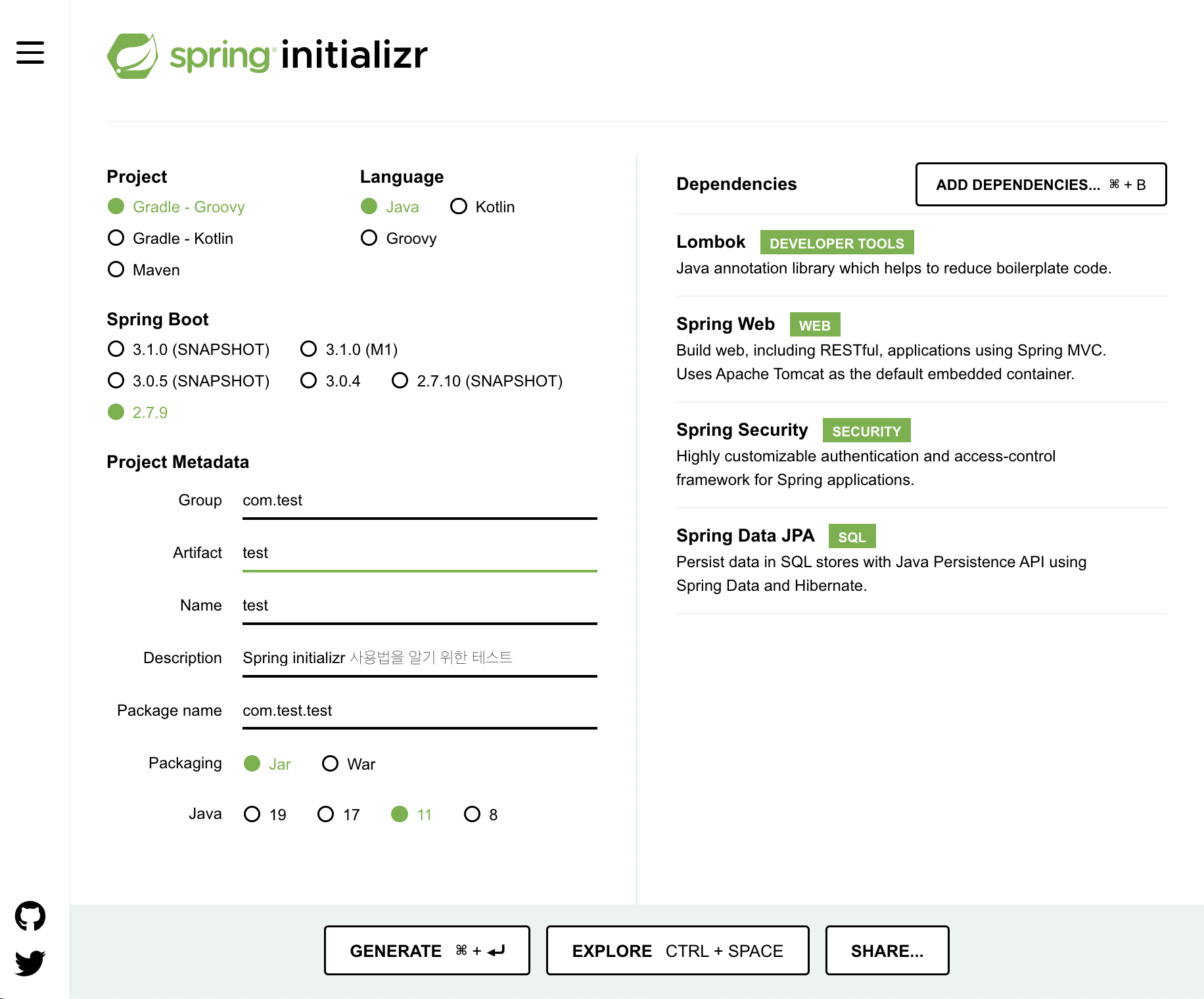 아래 Generate 버튼을 누르면 내가 설정한 내용대로 Spring 프로젝트를 다운받을 수 있다!