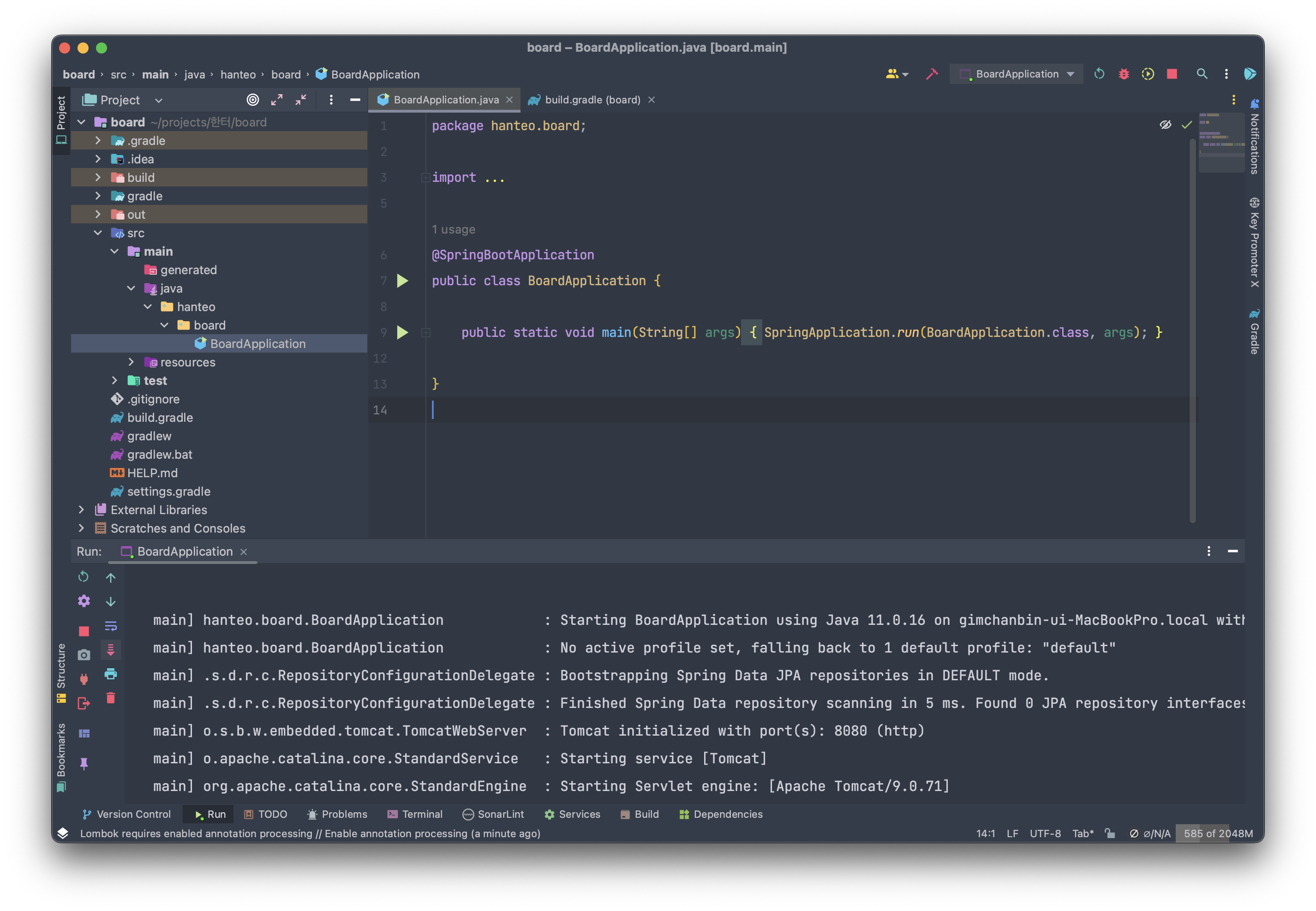 빌드가 끝났으면 src → main → java → ~Application 파일을 실행시킬 수 있다.