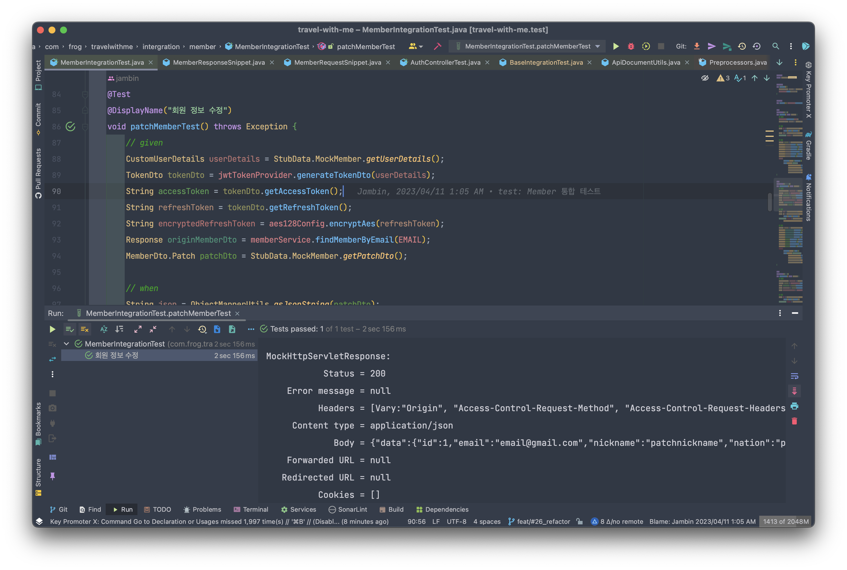 아래는 회원 관련 통합 테스트 코드이다. 편의를 위해 회원 정보 수정 테스트에 대해서만 이야기해보려 한다.