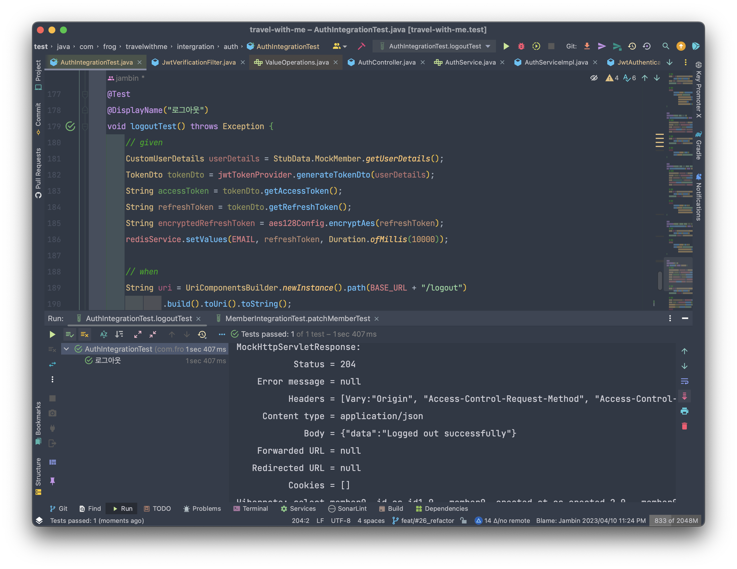 logout() : HTTP 요청(request)에서 Access Token과 Refresh Token을 꺼내서 authService로 넘겨준다.